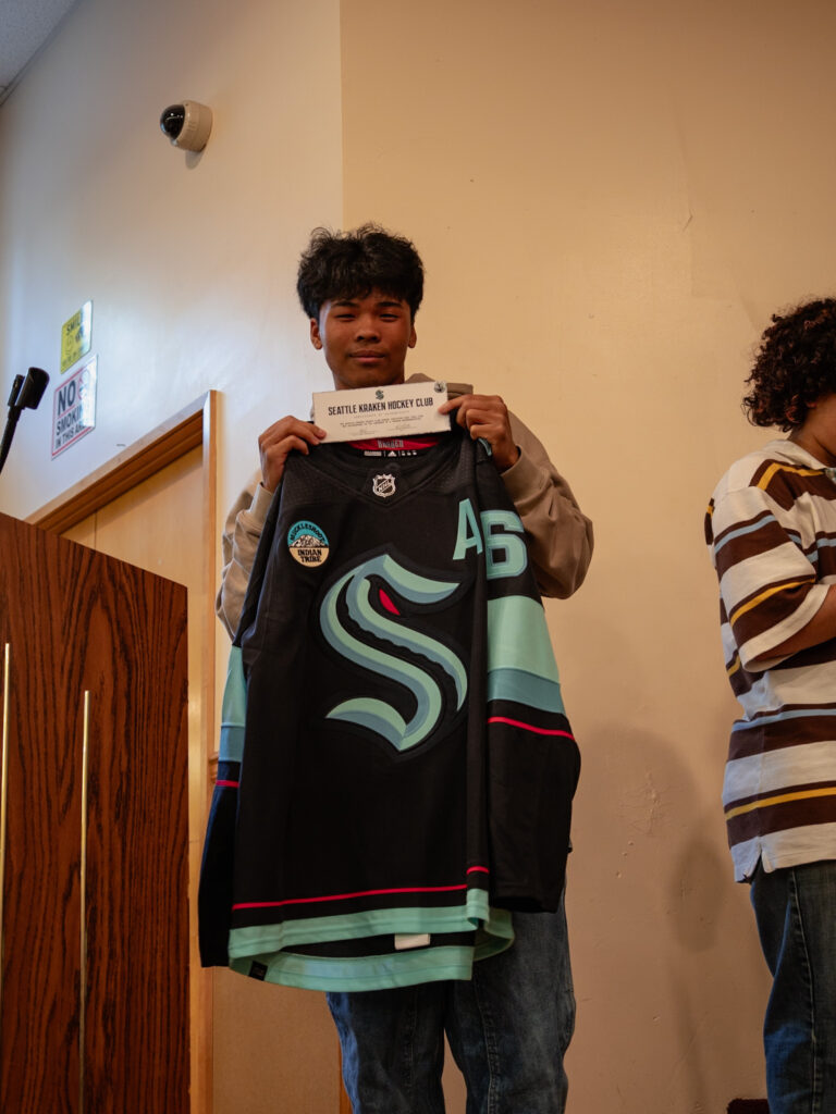 We also had a very competitive raffle where we gave out super cool prizes! We gave out a bunch of AGE UP gear as well as some signed memorabilia from our very own Seattle sports teams, including a Kraken jersey, a Seahawks football, a Seattle Storm basketball, and even some tickets to a Seattle Storm game. Check out one of the winners with his new swag, courtesy of the Seattle Kraken!
